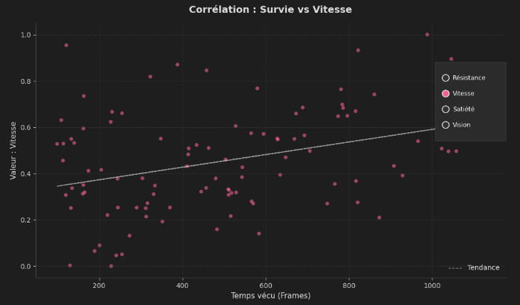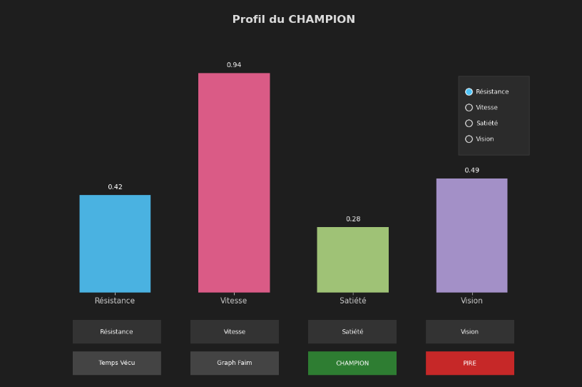 | Profil génétique | Résistance, Vitesse, Satiété, Vision | Voir la répartition des attributs et identifier les profils |